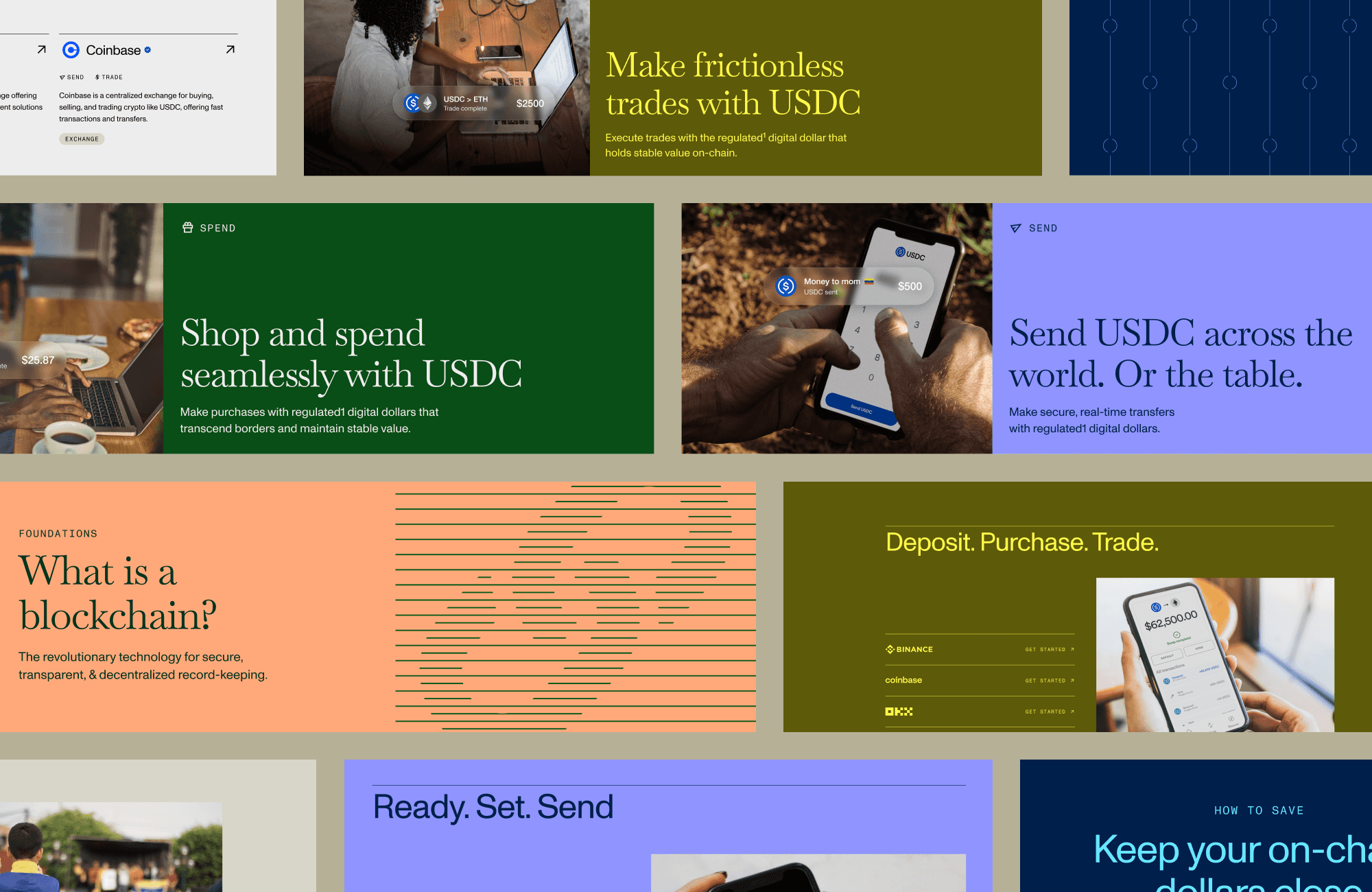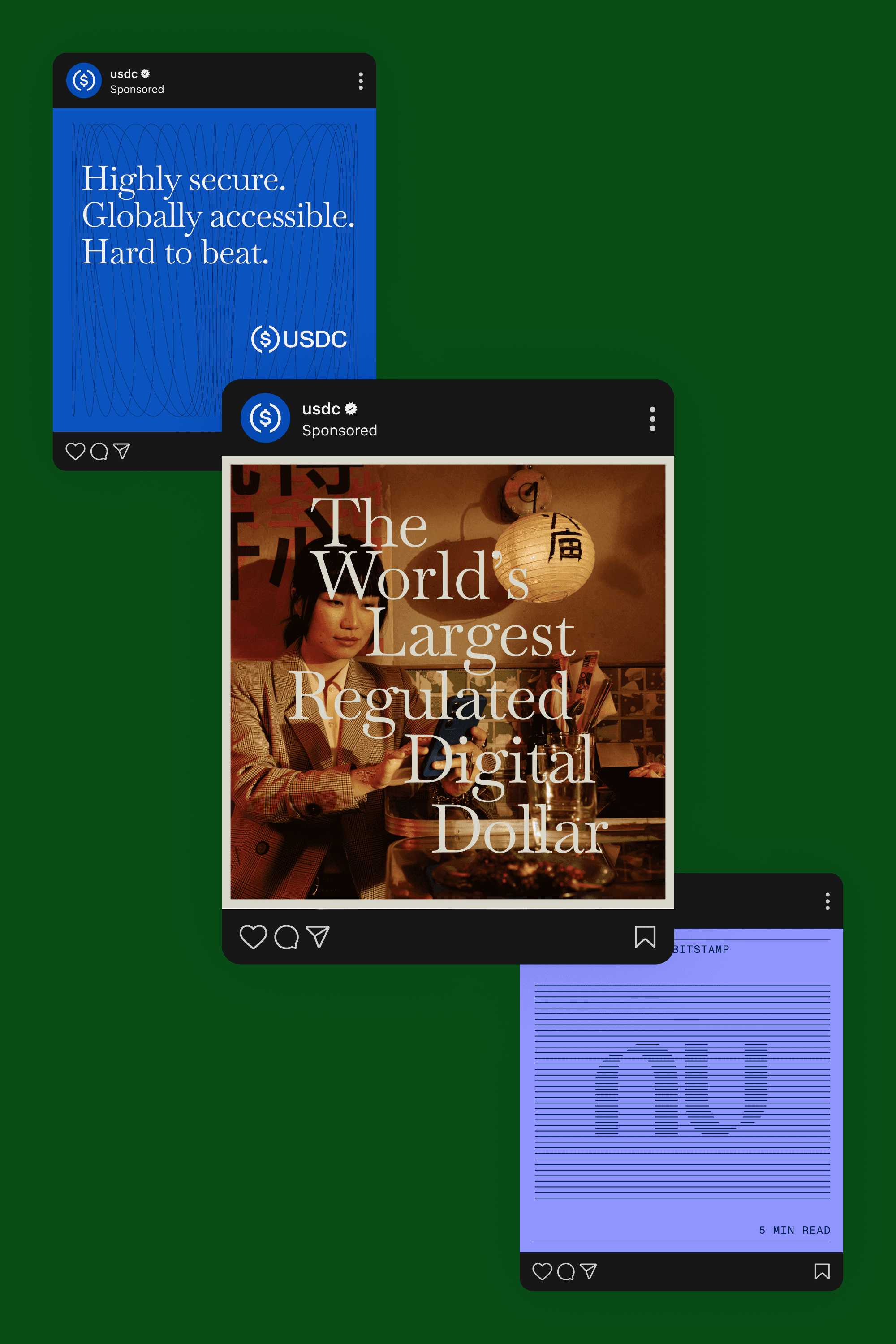 To reimagine the future of digital dollars, we partnered with Mother Design to craft a bold new identity for USDC. The refreshed brand draws from the historical significance of paper currency, a nod to the heritage of money, while elevating it with a premium, modern sensibility that reflects USDC’s role as the trusted digital currency.